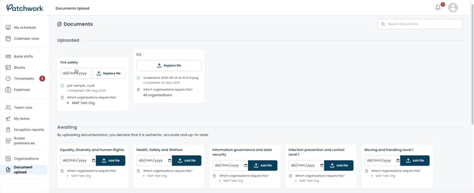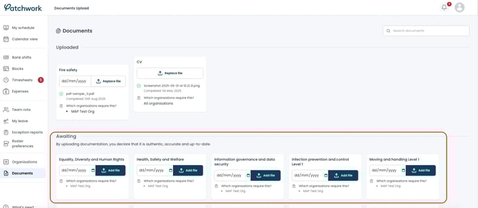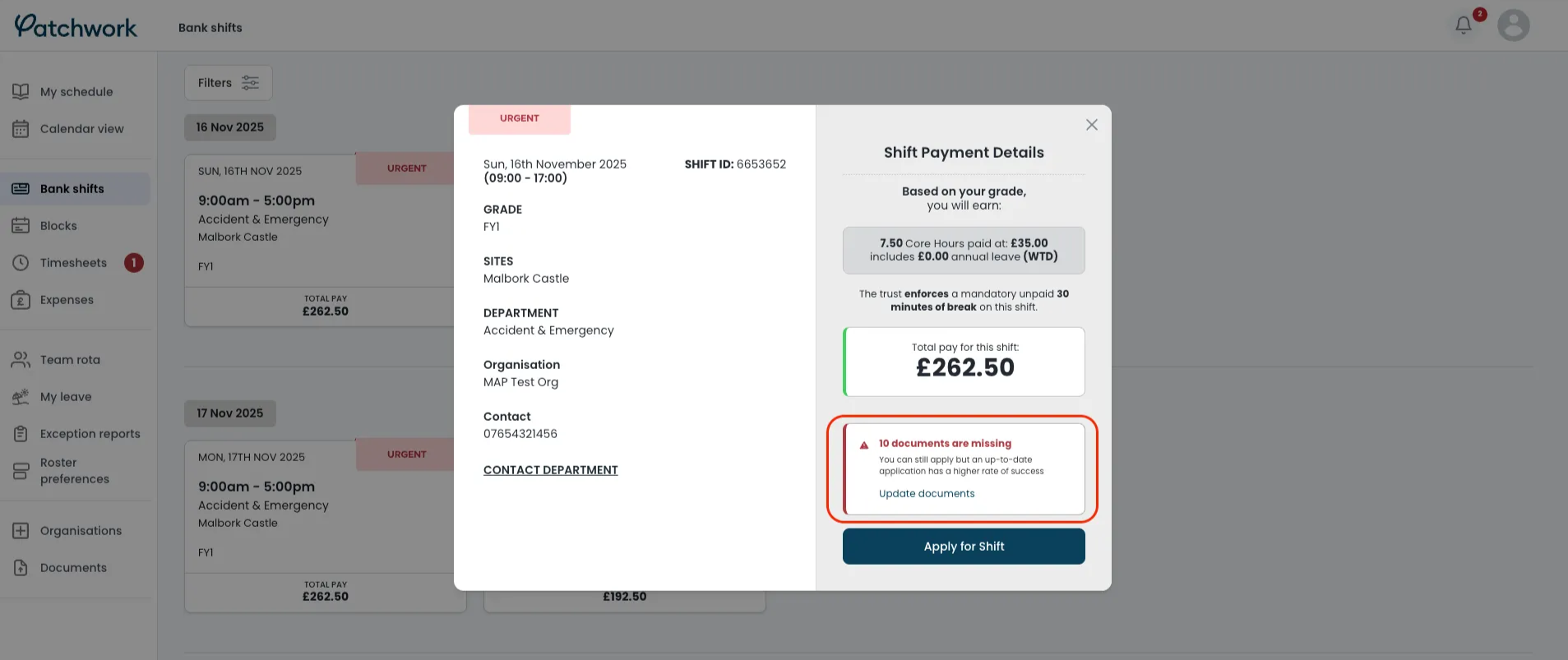 You’ll see when applying for shifts if you’re missing any mandatory documents: